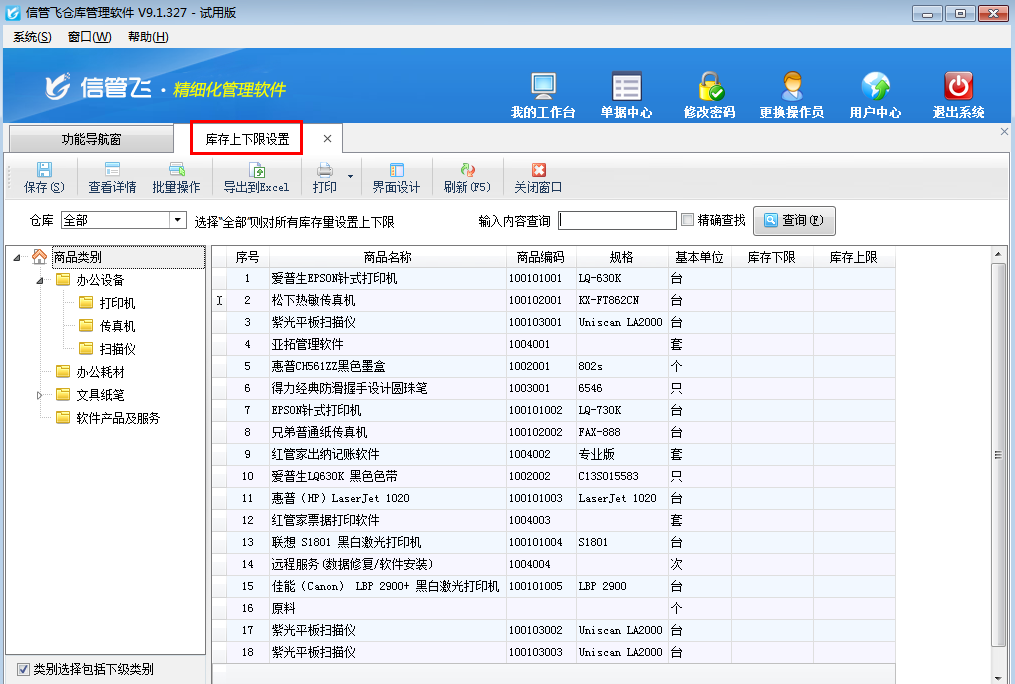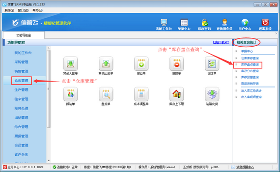 信管飛倉庫管理軟件、信管飛RMS支持庫存管理功能,為了更直觀的發現庫存數量,軟件中可以對商品庫存數量進行庫存上下限設置,并可以在倉庫管理模塊中的“相關查詢統計”中進行庫存預警查詢。以信管飛倉庫管理軟件為