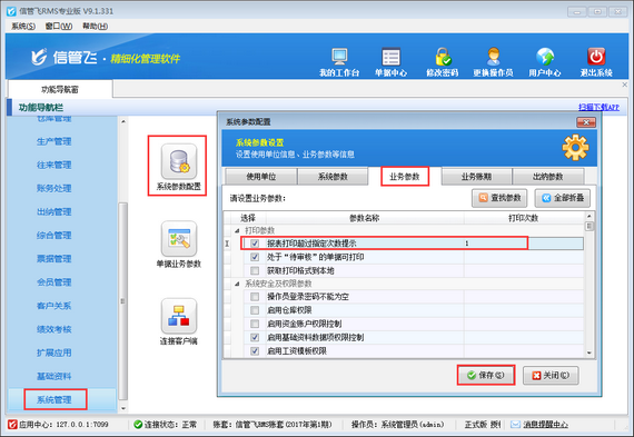 ????信管飛RMS、信管飛倉庫管理軟件、信管飛送貨單軟件都支持設置報表的打印次數,以此來限制單據的打印次數。通過設置這個參數,可以避免開單人員開單打印后又修改單據,出現軟件中的單據內容與打印出來的單據不一樣的...
